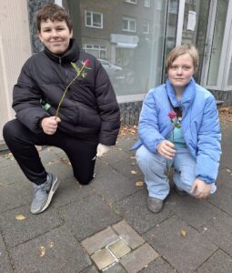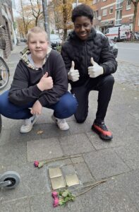 Ausgestattet mit der App „Stolpersteine NRW- Gegen das Vergessen“ haben sich die Schüler/-innen der 8c nun am 7. November 2025 mit Hilfe einer interaktiven Karte auf den Weg gemacht Stolpersteine im Kreuzviertel ausfindig zu machen und gründlich zu putzen. Zu jedem Opfer findet man auf der App außerdem biografische Texte, Illustrationen und historische Fotos, die das Schicksal der einzelnen Opfer des NS-Verfolgung erlebbar machen.